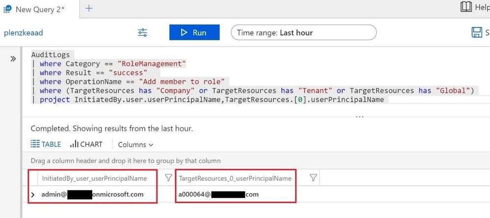 In the first example we search the Azure AD audit logs for accounts which have been successfully added to the global admin role and project this by initiator and target account.