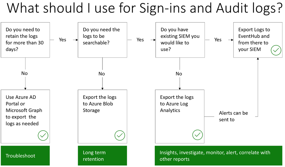 Another option is to use Azure Monitor. This can give you quick and easy insights into your Azure AD activities directly from the Azure portal. The chart below helps you decide which integration would fit your scenario.