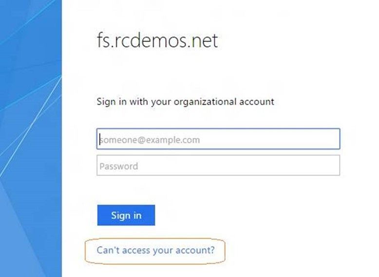 Absolutely! It only takes three steps using AD FS 2012 R2 web theme customization to add a nice "Can't access your account?" link in the sign-in page like below: