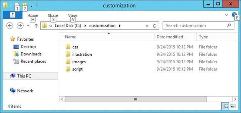 After this step, all the images, CSS, scripts, and other resources will be available in the local directory you specified (in this example c:Customization). The folder structure should look like this: