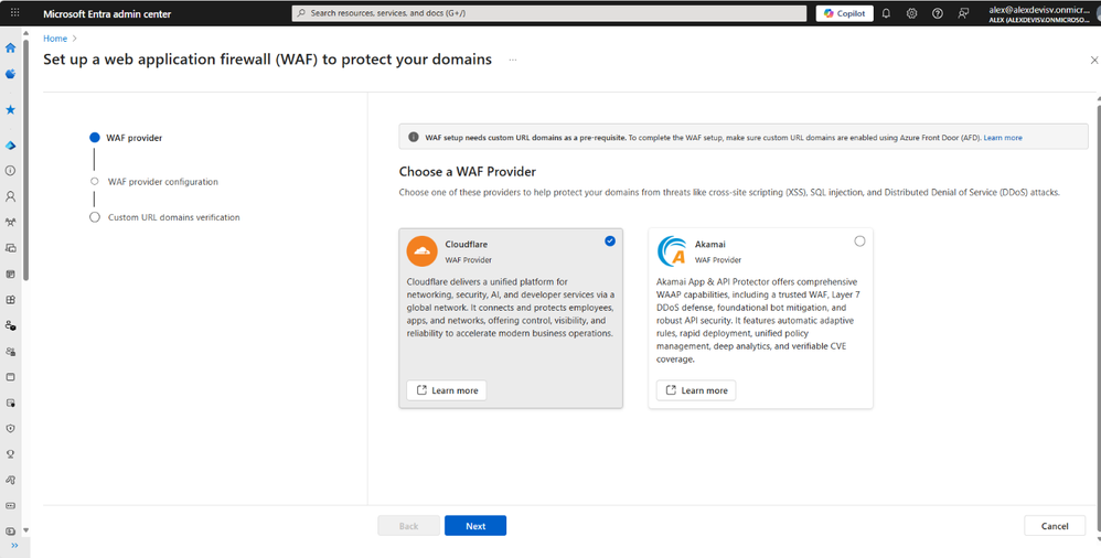 Cloudflare and Akamai deliver WAF to shield external-facing authentication endpoints from a range of threats like DDoS attacks, OWASP Top 10 risks, and malicious bots. This enables a layered security posture where traffic flows through Cloudflare or Akamai WAF, then Azure Front Door, before reaching your Microsoft Entra External ID tenant—keeping threats at bay before they reach your infrastructure.