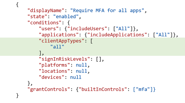 And for those of you who manage your policies using the Microsoft Graph API, we’ve simplified the client apps schema with the release of the new Conditional Access API in v1.0 to match the new UX. Here’s an example of the new default configuration for the client apps condition when you create a new policy using the API.