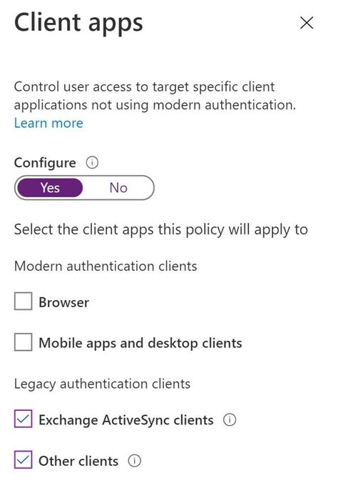 If you want to create a Conditional Access policy that only targets legacy authentication clients, switch the client apps Configure toggle to Yes and deselect Browser and Mobile apps and desktop clients, leaving Exchange ActiveSync and Other clients selected.