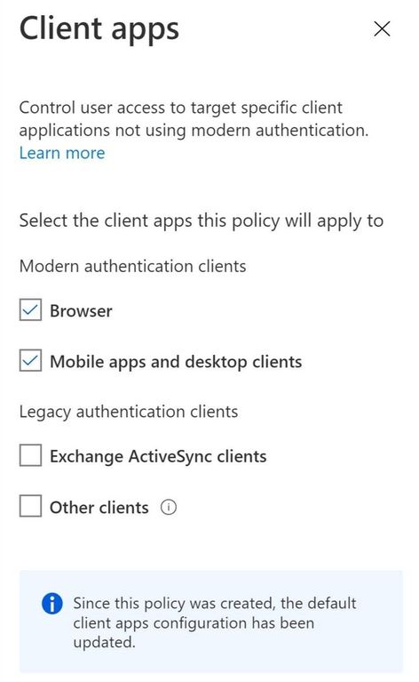 - New Conditional Access policies will apply to legacy authentication clients by default.
