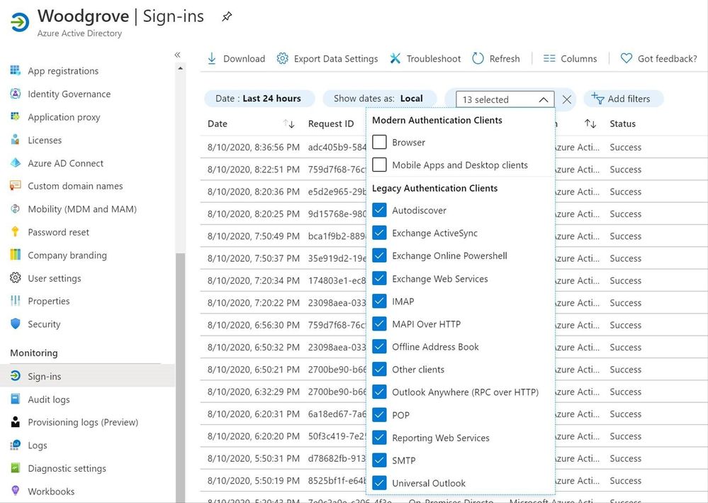 Before creating a new policy, it’s good to understand who’s using legacy authentication in your organization. To see which client apps and protocols are being used in your organization during sign-in, simply navigate to the Sign-ins page and filter the results by client app type.