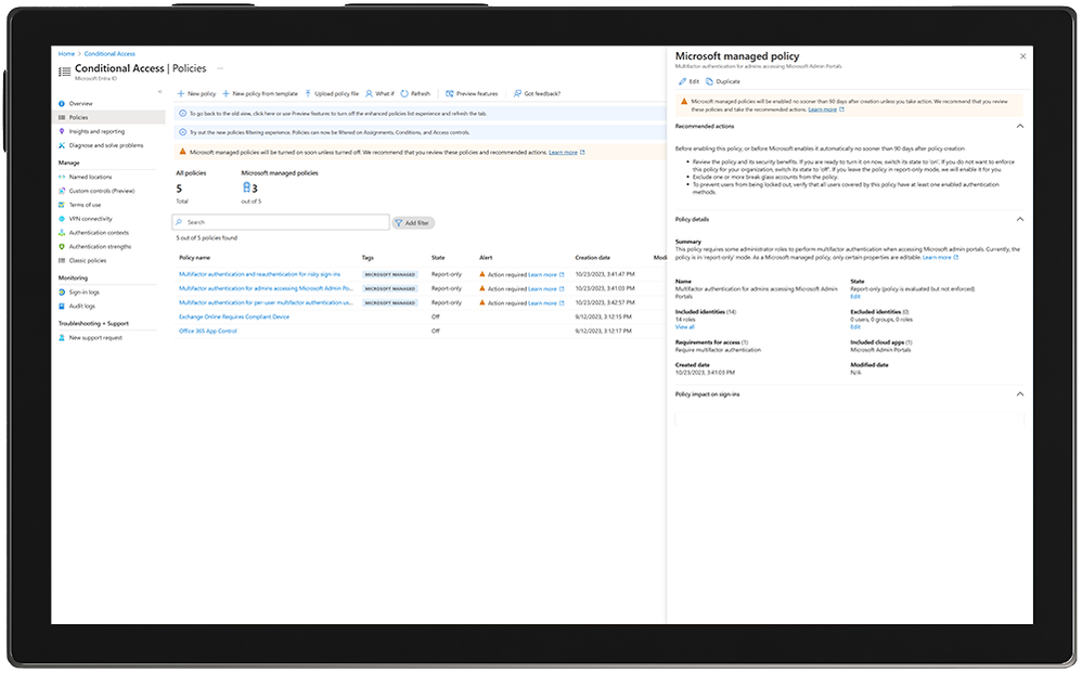 Last year, we turned on security defaults in Microsoft Entra ID (formerly Azure Active Directory) for almost seven million existing tenants, which cut the number of compromises in those tenants by 80 percent. Based on the positive customer feedback, we’re helping more Microsoft Entra ID customers protect themselves by automatically enrolling eligible tenants into Conditional Access policies based on customer risk signals, current usage, and licensing. Microsoft-managed conditional access policies will start with three policies that enforce multifactor authentication (MFA) in high-risk scenarios. You can learn more details in Alex Weinert’s recent blog post, Automatic Conditional Access policies in Microsoft Entra streamline identity protection.