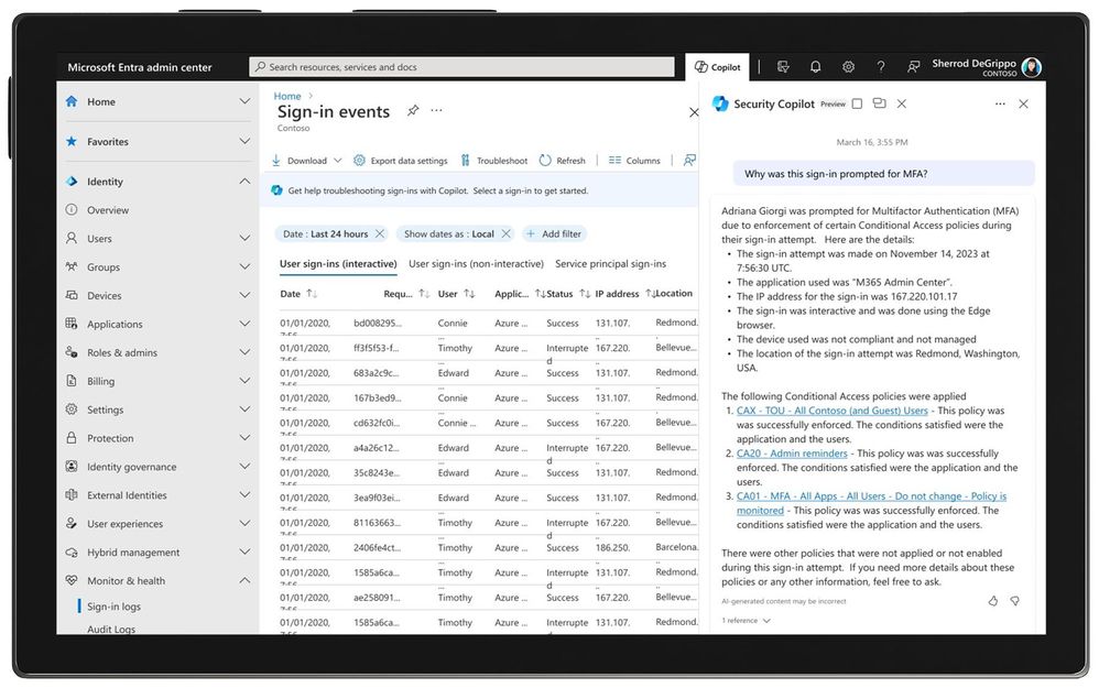 In the Microsoft Entra admin center, Microsoft Security Copilot explains in simple, conversational language what a Conditional Access policy does or why MFA was triggered.
