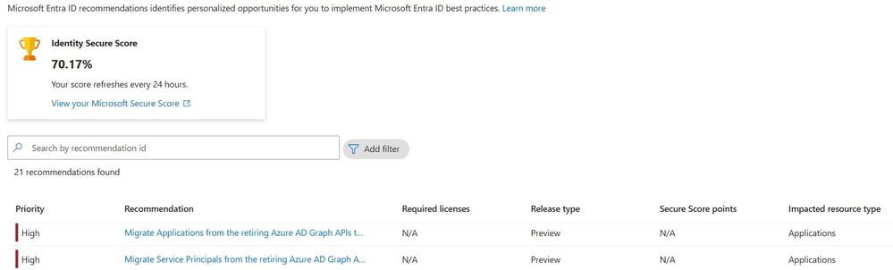 We’ve provided two Entra recommendations that show information about applications and service principals that are actively using Azure AD Graph APIs in your tenant. These new recommendations can support your efforts to identify and migrate the impacted applications and service principals to Microsoft Graph.