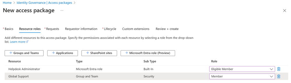 1. Create an access package and add the Helpdesk Administrator Microsoft Entra role as “Eligible member” and Service Support Administrator as “Active member”.