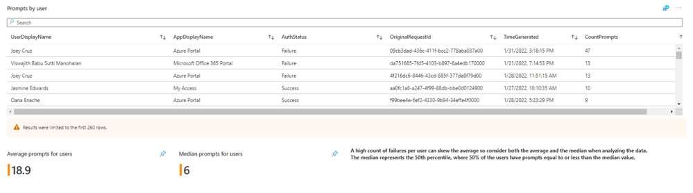 If we scroll down a bit farther, we have a summary of users with the most prompts and additional information for troubleshooting such as application, time stamp and request ID. For a reference point, you can also see the average and median prompt count across all users. The top users in this list likely are having a bad experience. This is typically because something is misconfigured or maybe the account is under attack. Either way, investigation is warranted and action should be taken.