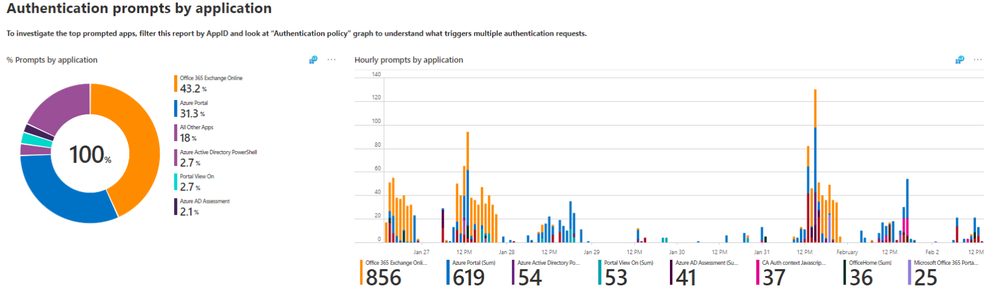 If an application is misconfigured, it may attempt to continuously attempt to authenticate unsuccessfully and ultimately have a very high prompt count. With that in mind, look out for applications that have a disproportionally high percentage of prompts. For many customers the most used apps will be the business productivity apps. Anything that isn’t expected should be investigated.