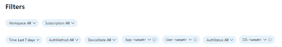 One final workbook tip: at the very top of the workbook, you can continue to get more granular in your filtering. Filtering for a specific user having a lot of authentication requests or only showing applications with sign-in failures can also lead to interesting findings to continue to remediate.