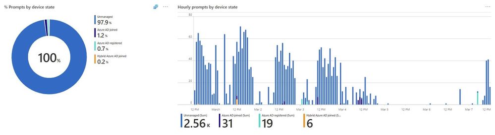 Authentication prompts by device state is a view of how many prompts are attributed to devices that are Azure AD joined, Hybrid Azure AD Joined, Azure AD registered, or completely unknown to Azure AD, aka ‘unmanaged’.