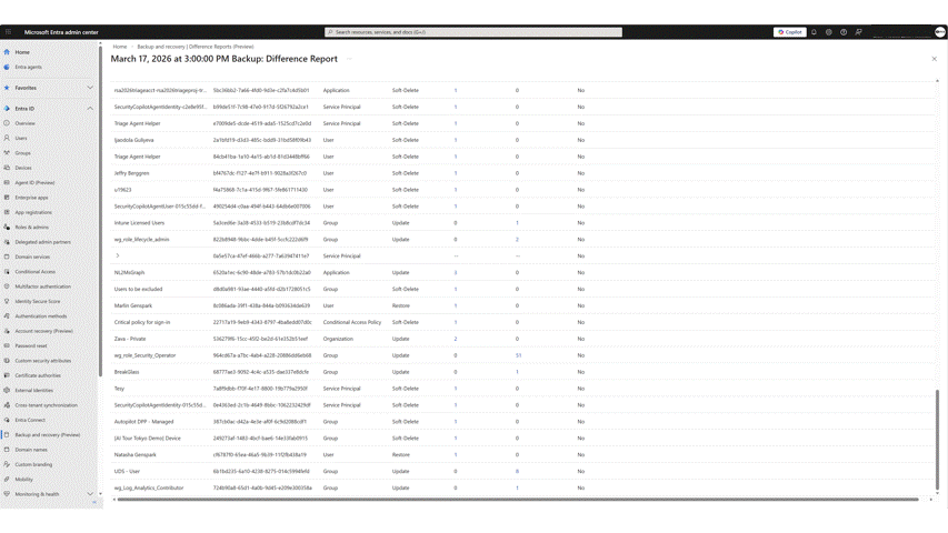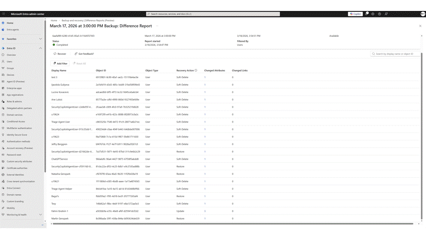Once the immediate threat is contained, the identity team must determine exactly what changed and restore trusted configurations as quickly as possible. Manually reviewing and rebuilding identity settings across multiple objects would be time consuming and increases the risk of missing subtle but impactful changes. In addition to malicious configuration changes, malicious actors may also delete critical identity objects, which Microsoft Entra Backup and Recovery can restore by integrating with soft‑deletion as part of the same recovery process.