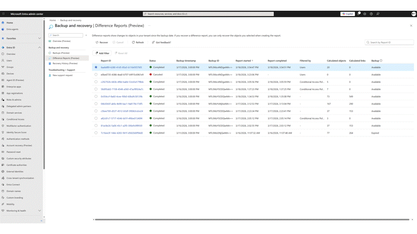 To get started, sign-in to the Microsoft Entra Admin center as an Entra Backup Administrator role. In the left navigation, select Backup and Recovery to explore your automatic backups, generate Difference Reports, and run recovery jobs. From here, you can review your snapshot history, investigate configuration changes across your directory, and begin restoring objects as needed.