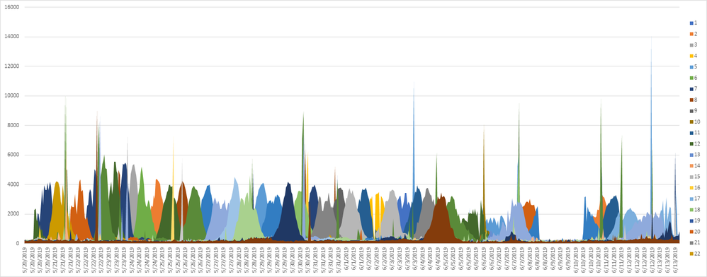 The graph below shows a recent pair of password spray attacks by way of example. Each color represents the hash values of failed password requests; the “hills” indicate multiple failures on the same hash value in that timeframe. There are two distinct attackers – the lower “hills” try 45 distinct password pulses over 22 hashes at around 4,000 accounts per hour; the higher “spikes” try 15 at around 10,000 accounts per hour, running over two weeks. Note the overlap in hashes used by the attackers.