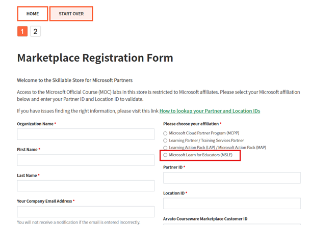 3. Complete the form and select Microsoft Learn for Educators (MSLE) as your affiliation.