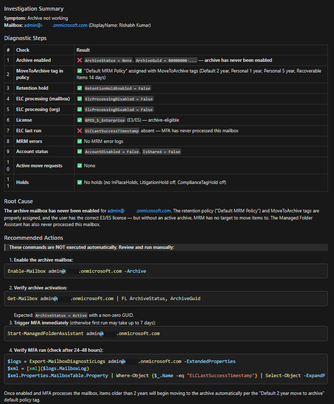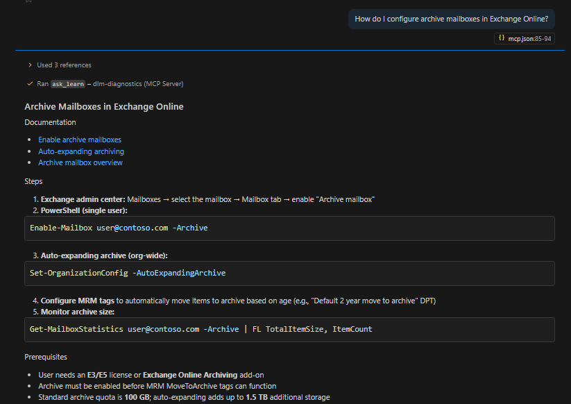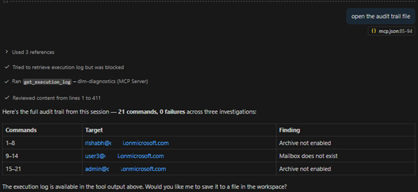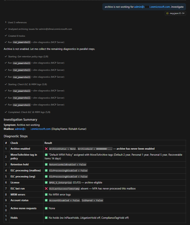 The DLM Diagnostics MCP Server brings AI‑assisted, auditable, and safe troubleshooting to Microsoft Purview Data Lifecycle Management. By combining structured troubleshooting guides with read‑only PowerShell diagnostics and MCP, it significantly reduces the time and expertise required to diagnose complex DLM issues.