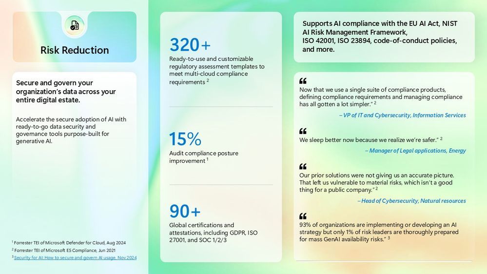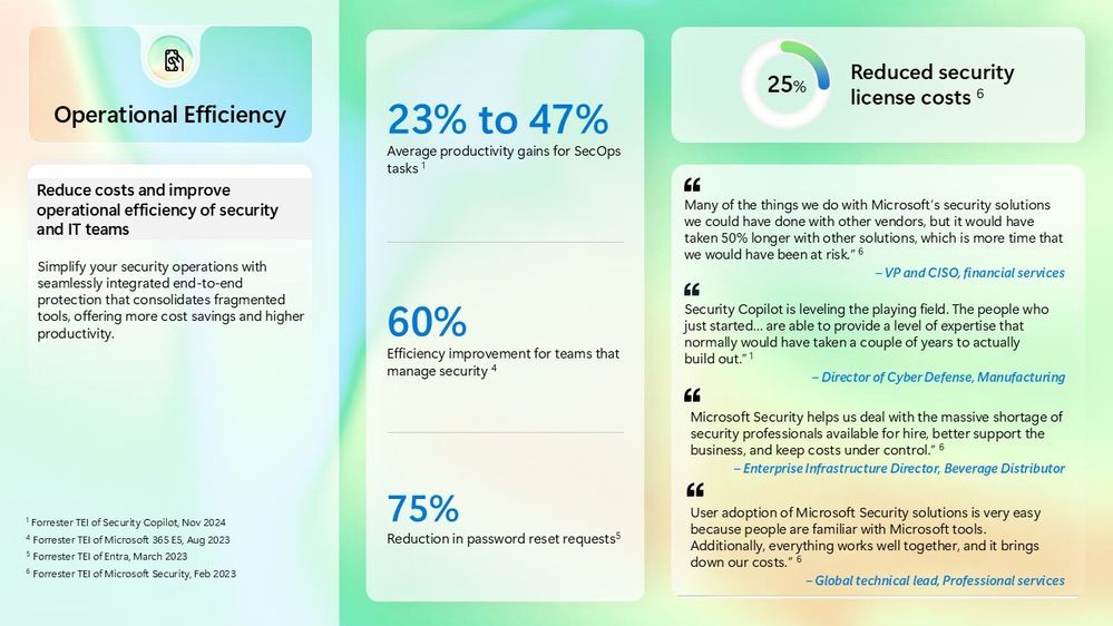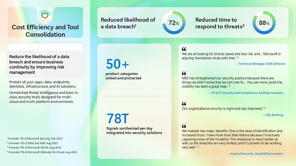 The Forrester TEI study found that by consolidating onto Microsoft’s platform, the composite firm reduced exposure to breach costs by 75%. In monetary terms, this was modelled as $2.8 million savings from avoided or mitigated breaches over three years. The logic is that with better visibility and quicker response, either some breaches were prevented outright or their scope was limited such that incident losses were far lower than they would have been. The study cited “dramatically reducing the likelihood and impact of breaches” through real-time visibility and coordinated defense, Forrester TEI info, TEI info.