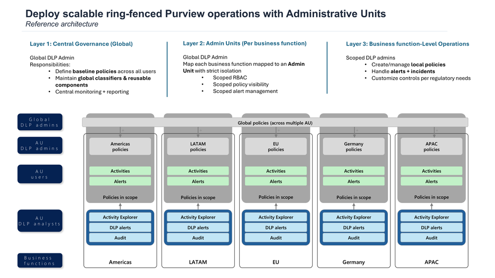 This post focuses on the why behind using Administrative Units in Microsoft Purview, with a particular emphasis on scalable, ring‑fenced operations. We’ll walk through three reference architectures that illustrate how Administrative Units support real‑world operating models—without requiring multiple tenants or separate DLP platforms.