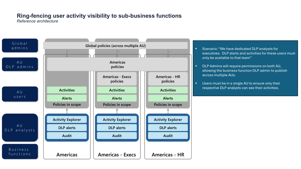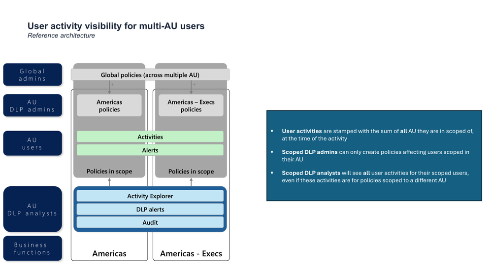 It also reinforces a key principle: Administrative Units control visibility and management scope — not the existence of the underlying activity data. Once a user's in scope of a policy, its related activities/alerts are visible to DLP analysts allowed to review this user's activities.
