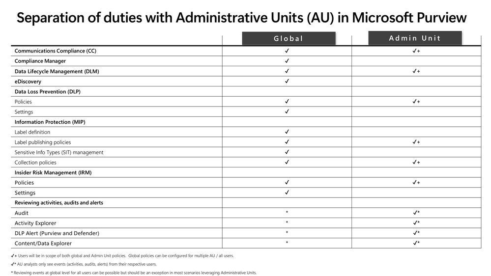 It delivers strict separation of duties without duplicating policies or creating isolated tenants, and aligns with how Purview scopes alerts, activity explorer, and audit data when Administrative Units are used.