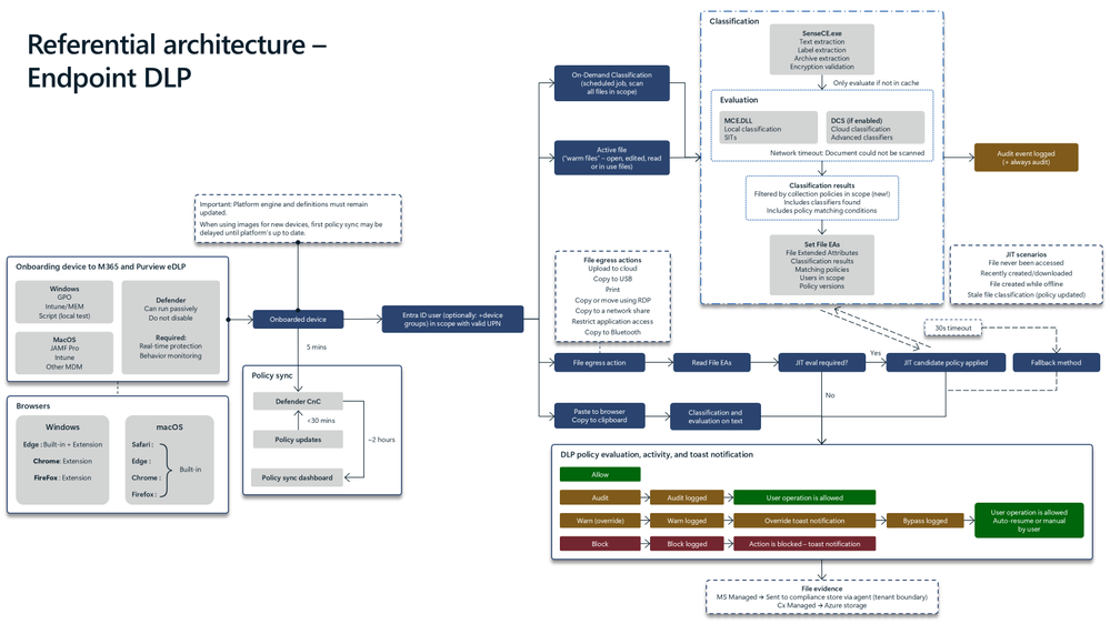 - Content is classified locally (+ optionally in the cloud) and evaluated against DLP policies in real time.