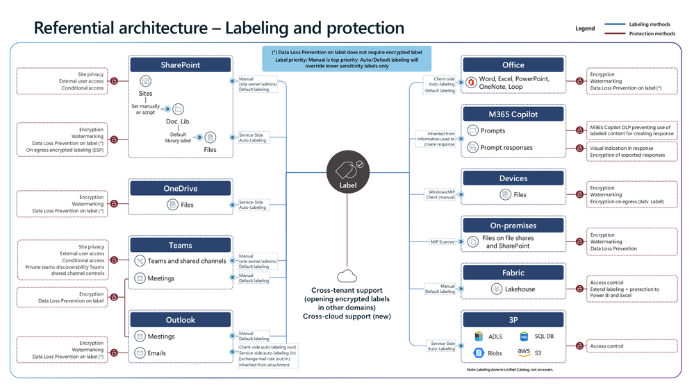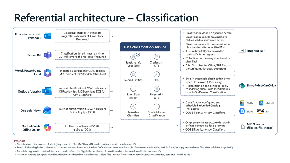 The Microsoft Purview architecture diagrams provide a referential view of how data classification, sensitivity labeling, Data Loss Prevention (DLP) and Insider Risk operate across Microsoft 365 workloads. These diagrams are intended to help organisations understand where policy evaluation occurs, how signals flow between services, and how enforcement is applied consistently.