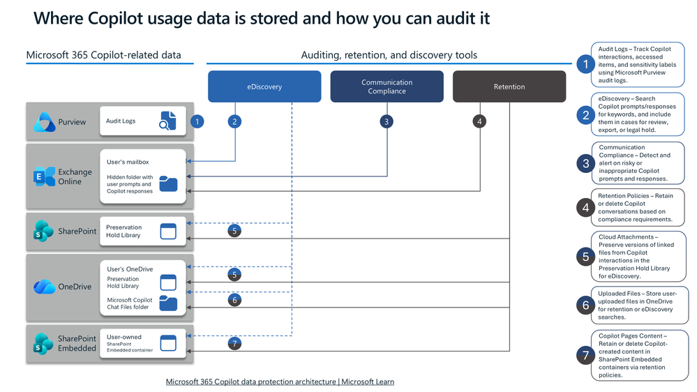 - Prompts and responses are stored in user mailboxes, OneDrive, or SharePoint Embedded containers.
