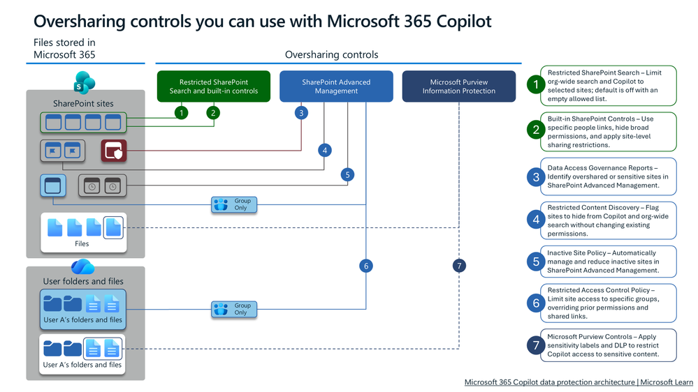 This diagram shows how SharePoint, Purview, and Copilot controls work together to reduce accidental oversharing.
