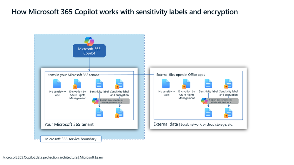 This diagram explains how Copilot respects sensitivity labels, encryption, and tenant boundaries when generating responses.