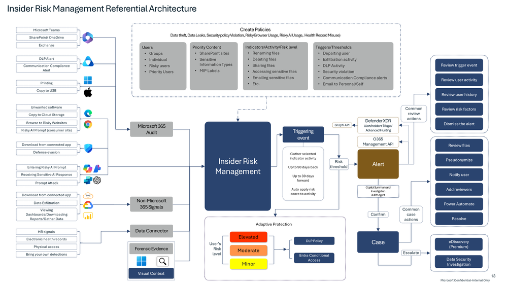 - Signals are ingested from user activities, DLP, audit logs, communication compliance, Defender, and third‑party sources.