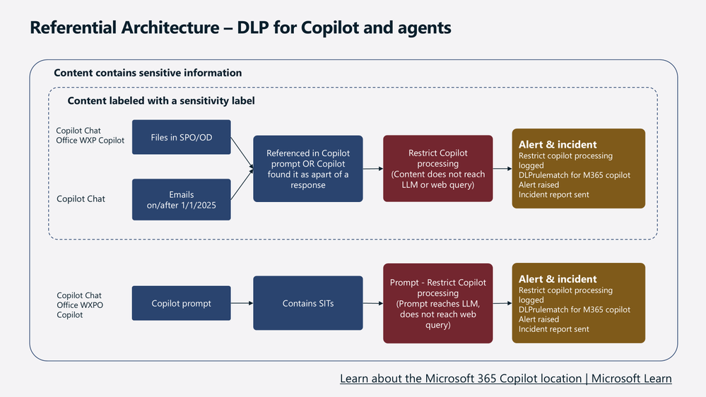 This diagram brings together classification, labeling, and DLP to show how Copilot‑related actions are evaluated.
