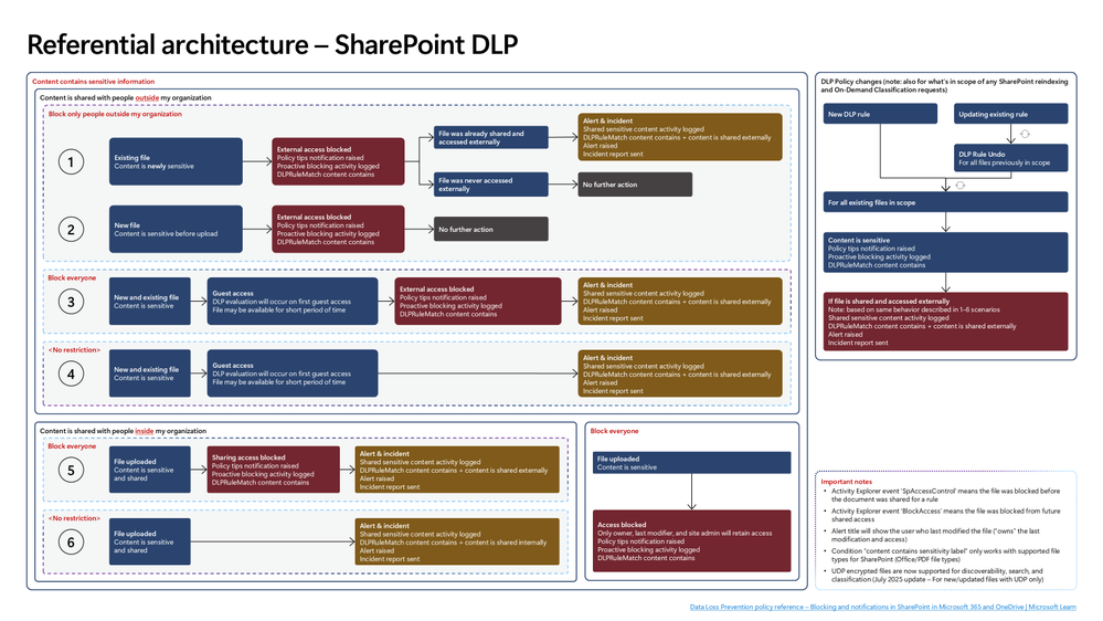 The SharePoint DLP diagram illustrates how DLP policies are enforced as files are uploaded, shared, and accessed in SharePoint and OneDrive.