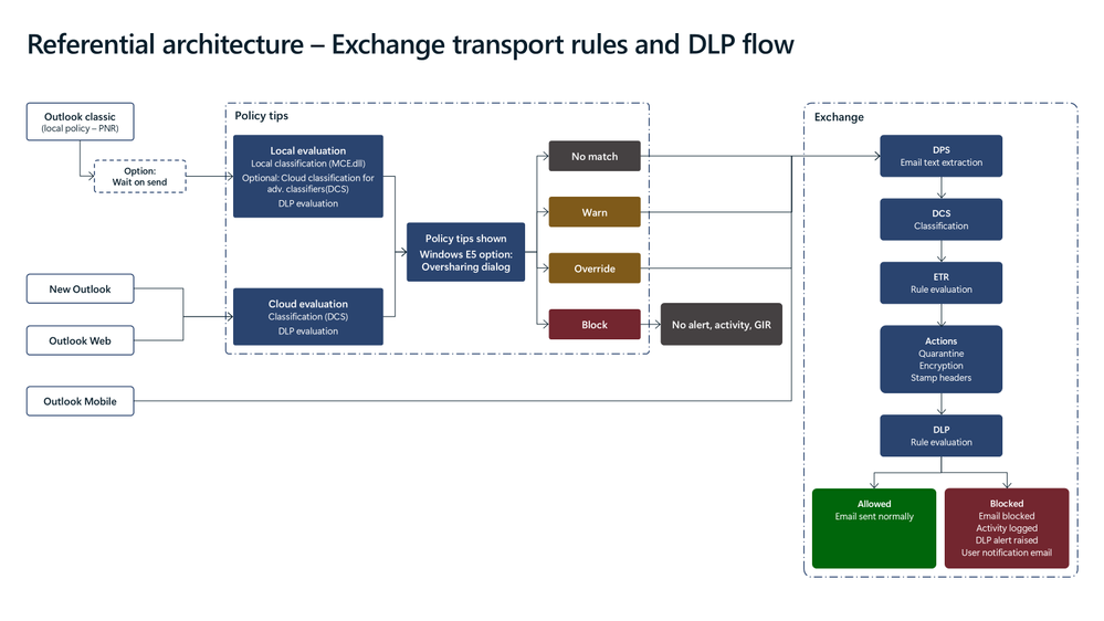 - DLP evaluation occurs before delivery, with actions such as policy tips, warnings, blocking, or encryption; and also in transport to ensure protection at all layers.