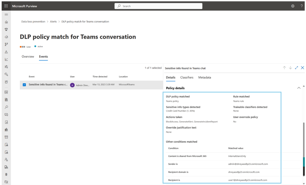 - In the events details in DLP alerts page in the Microsoft Purview compliance portal