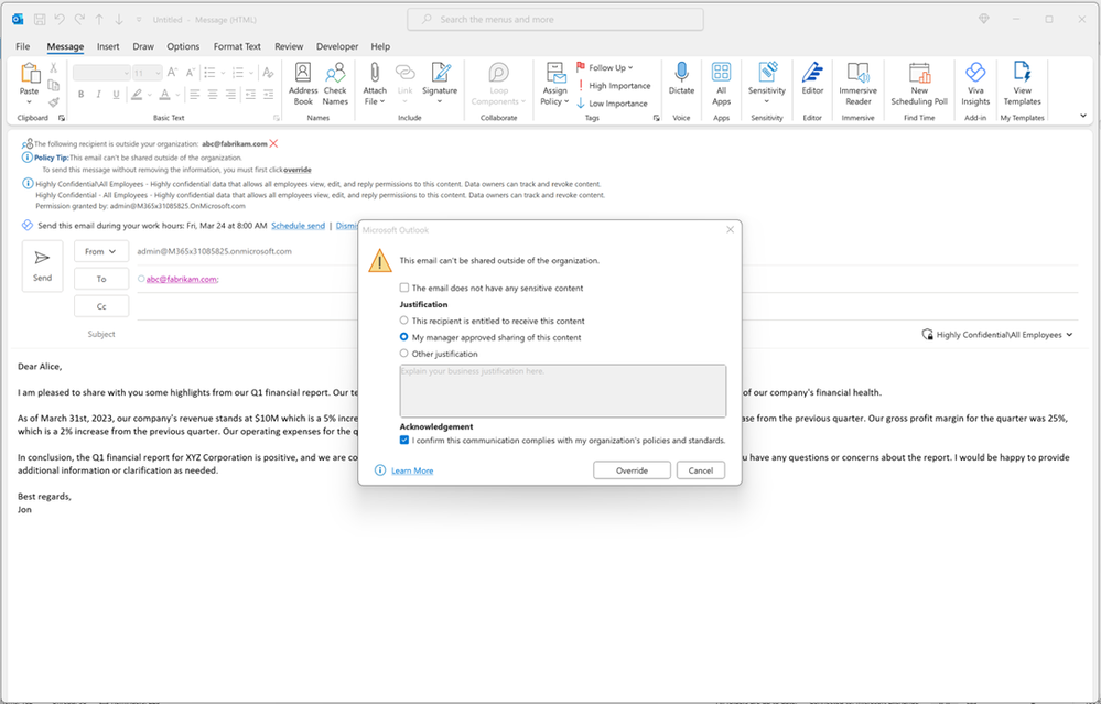Figure 11: Policy tip triggered as the user is trying to share an email with a specific sensitivity label and sensitive financial content with a user in an untrusted domain