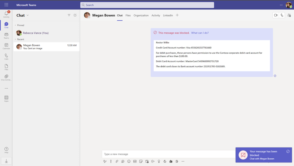 Figure 1: Blocking a user from sending a screen capture of sensitive document in Microsoft Teams
