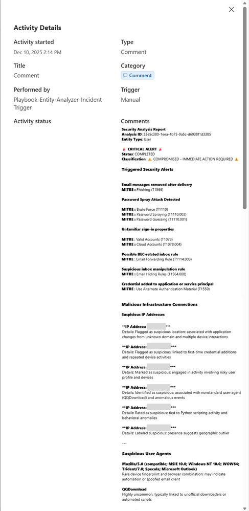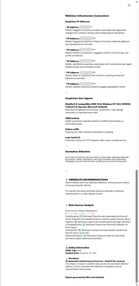 This screenshot shows how the analysis would appear within an incident's comments section. See the below pictures for a zoomed-in view of the analysis text.*IP addresses have been redacted for this blog*This screenshot shows the analyzer's top-level classification that a user account is compromised along with its supporting evidence, starting with the series of alerts and their associated MITRE ATT&CK techniques, a list of malicious IP addresses the user signed in from (redacted for this blog), and a few suspicious user agents the user's activity originated from.This screenshot shows the rest of the supporting evidence (the remaining suspicious user agents and a list of anomalous behavior). By providing these pieces of evidence, the analyzer can make security analysts, who typically have to query and analyze these themselves, feel more comfortable trusting its classification. The analyzer also gives recommendations to remediate the account compromise, and a list of data sources it used during analysis.