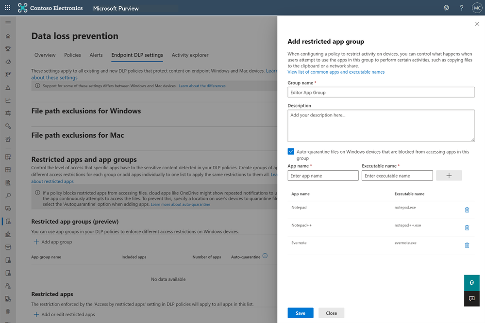 Figure 1: Restricted app groups settings in endpoint DLP
