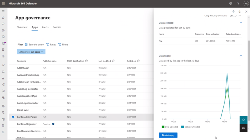 Insights: See a view of all the third-party and LOB apps for the Microsoft 365 platform in your tenant where you can see all the apps’ status and alert activities and react or respond to them. With app governance, gain actionable insights into the behaviors of the apps that are accessing your Microsoft 365 data.