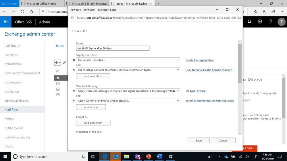 Once the custom template is created, in the Exchange admin center, you can create a mail flow rule that applies the custom template based on set conditions. For example, if the message contains the key word ‘confidentiel’, for example, the email will be automatically applied with the desired encryption policy and custom template.