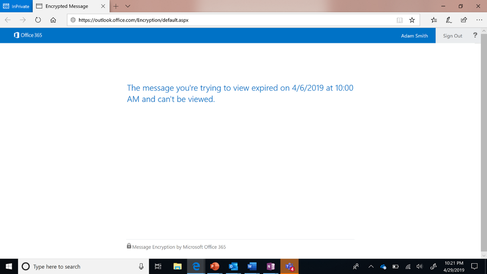 From the perspective of the recipient, after the message is sent, they would see the branded template with the expiration date. Once the encrypted email has expired, the email will no longer be accessible through the Office 365 web portal.
