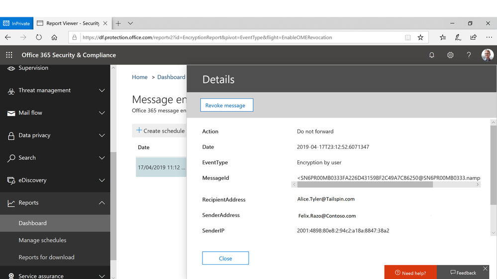 Whether it’s due to malicious attack, accidental sharing of encrypted emails, or changes in who is authorized to view encrypted emails, admins can now go into the encryption report to find encrypted emails and revoke access through a new UI experience inside the Office 365 Security and Compliance Center.