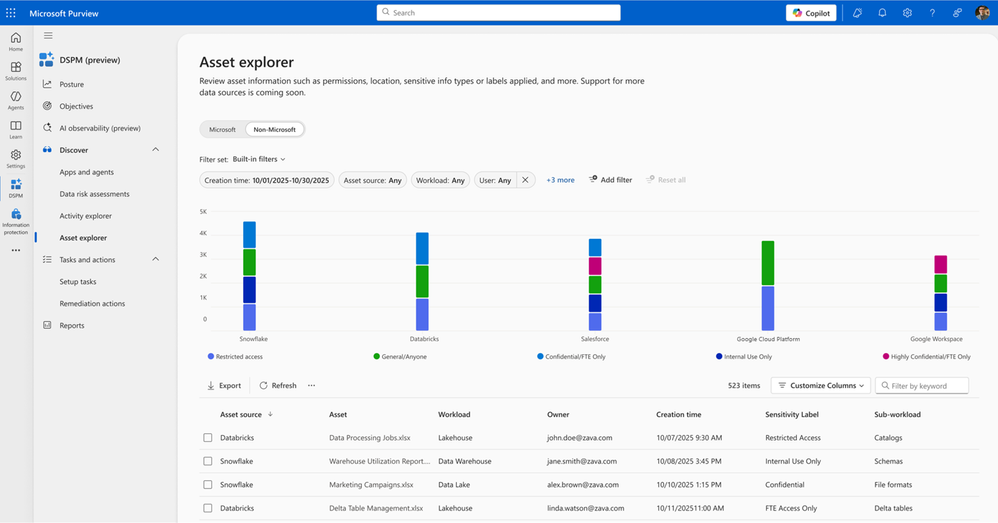 This partnership, possible via integration with Microsoft Sentinel Data Lake, is designed to help organizations see and understand more of their data—wherever it resides. Through DSPM, a customer will be able to easily turn on these external data signals and evaluate data asset information (such as permissions, location, sensitive information types) in these environments. Available sources initially will be: Salesforce (provided by Varonis), Databricks (provided by BigID), Snowflake (provided by Cyera), and Google Cloud Platform (provided by OneTrust), with additional external data coverage coming soon.