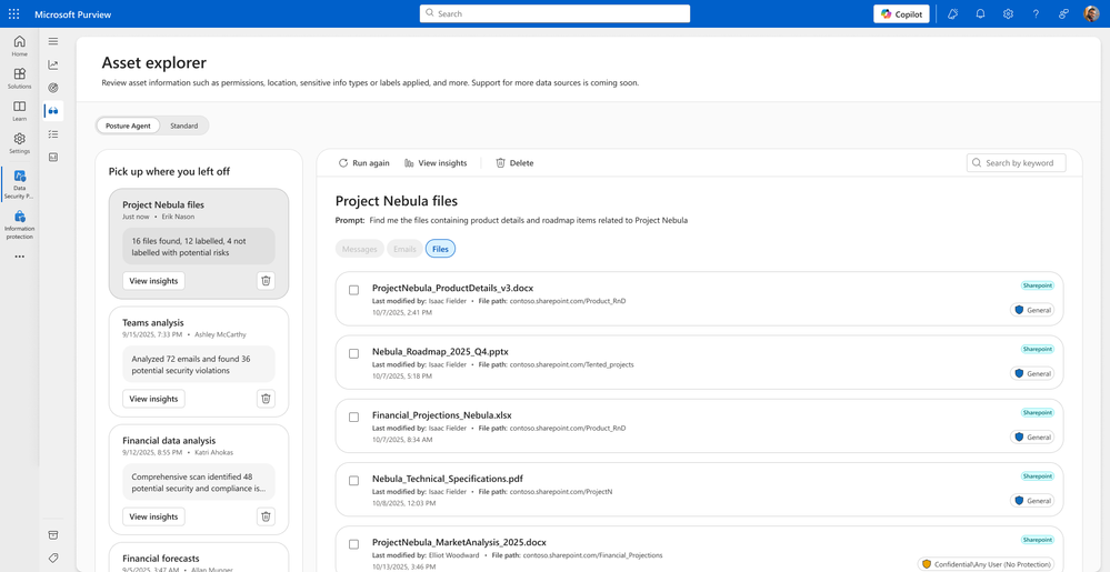 That’s why we’re thrilled to introduce the Data Security Posture Agent, designed to augment the new Purview DSPM experience even further. This agent leverages LLMs to understand context and intent, going beyond traditional classifiers that can often miss nuance. It analyzes selected file sets and generates precise reports on requested information, such as merger & acquisition details or PO numbers. Armed with these insights, admins can decide on their own next steps, whether that’s applying new labels, updating policies, or initiating investigations, streamlining discovery and risk reduction in one intelligent, outcome-driven experience. This capability tackles the challenges of manual, time-consuming data analysis and limited visibility into sensitive information, helping organizations achieve faster resolution, stronger compliance posture, and greater operational efficiency.