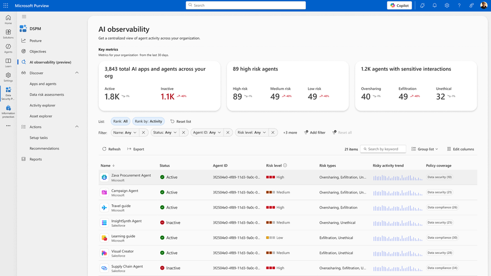 ▪ AI Observability for agents: We’re introducing a dedicated view within DSPM that treats agents—such as the ones created on Microsoft 365 Copilot, Copilot Studio, and Azure AI Foundry—as first-class entities in your organizations when it comes to data security posture. It provides a unified inventory of all agents – including third-party agents – as well as the assigned insider risk level based on the agent behavior, posture metrics, and activity trends of each agent. Security teams can drill down into individual agents to see contextual insights like risky behaviors, oversharing patterns, and can take recommended actions, such as the creation of retention policies. AI Observability gives customers clear visibility across agents and connects insights to guided actions— simplifying governance, facilitating risk prioritization, and enabling secure AI adoption without slowing innovation.