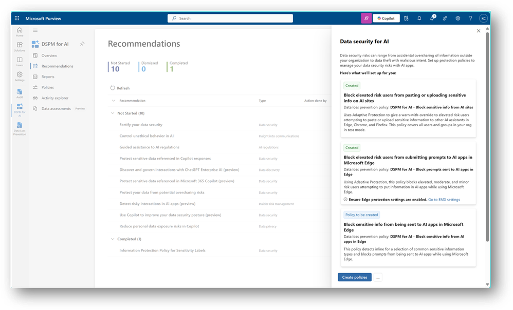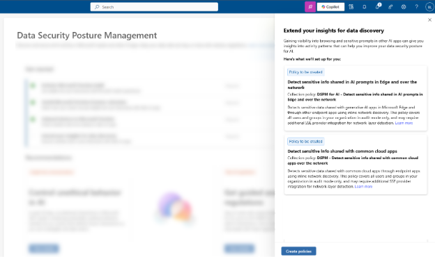 Similarly to inline data discovery for the network, visibility into sensitive data use in Edge for Business will now surface in Purview DSPM, even if a protection policy has not yet been deployed. If DSPM observes high data exfiltration risk originating from Edge for Business, it will proactively recommend a set of data security policies to mitigate that risk, such as blocking typed sensitive data and sensitive files from being sent to consumer AI apps.