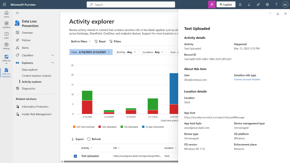 Figure 2: Admins can understand what type of sensitive data was exfiltrated and where it was sent from Activity Explorer.Use of unsanctioned generative AI applications or plugins: Some employees in your organization may have installed an unsanctioned GPT plugin for their Microsoft Word application, for example. If they prompt the plugin to summarize the contents of the Confidential merger & acquisition document that is open, this prompt will also be captured in Purview DSPM for AI. Learn more about inline discovery of sensitive data in GenAI applications in this blog.