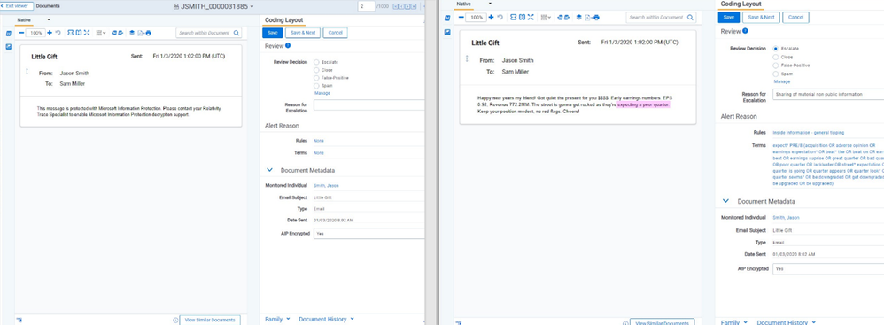 Relativity Trace is used by compliance teams to monitor the communications of high-risk individuals – across email, chat, email, and audio – in near real-time. Using AI and machine learning the system automatically flags conversations that exemplify scenarios of collusion, corruption, complaints, market manipulation, excessive gifts, sharing of sensitive information and others for compliance analysts to review. Our clients know that encrypting data through the use of Microsoft Information Protection (MIP) labels greatly improves overall security within their organization, but the encryption of content can make it difficult for compliance teams to identify internal threats. To solve this issue, Relativity Trace has built secure MIP decryption into the product using the MIP SDK, so all content can be analyzed for risk and compliance analysts can understand the complete story of a communication. This integration ensures compliance teams can efficiently protect their organization and meet regulatory obligations without degrading security throughout the organization.